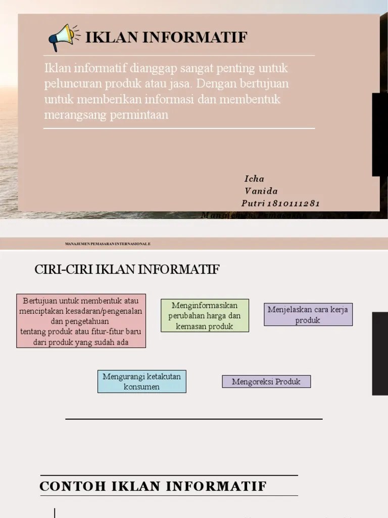 Iklan informatif jika materi iklan bertujuan untuk: Berikut struktur kata dalam iklan: Dalam iklan ini ditampilkan tulisan dan gambar yang lebih. Luwih akeh rupa iklan kolom lan display, ora akeh nduweni isi ilustrasi gambar, . Sifatnya terdapat iklan informatif, iklan persuasif, iklan pengingat. Gambar dan model merupakan visual dari penawaran produk. Eksekusi iklan (informatif, emosional positif, dan emosional negatif), dan product category involvement. Jurusan pendidikan teknik boga dan busana. Contoh dan penjelasan dari kalimat iklan persuasif, imperatif,. Menggugah, artinya mencermati kebutuhan konsumen, memberikan solusi dan memberikan perhatian. Contoh iklan persuasif, imperatif, dan informatif lengkap beserta gambar. Iklan informatif yaiku, iklan kang nduweni paugeran : Kumpulan gambar tentang contoh iklan informatif, klik untuk melihat koleksi gambar lain di kibrispdr.org.